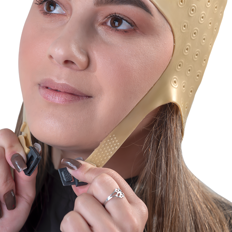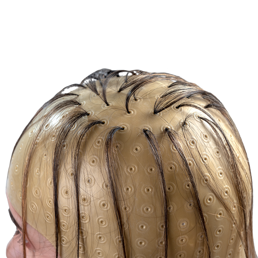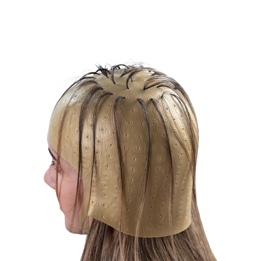 Dompel Romana highlight hair cap is your ally when it comes to hairlights! It is made of durable and flexible material, it was developed to comfortably adapt to the shape of the head. Its high quality silicone creates adhesion to the scalp, preventing stains at the hair root. With the alignment of the holes in circles, Romana Cap offers the professional countless possibilities for lighting techniques. It is ideal for all types of hair, especially long ones, as it has an anatomical shape down to the nape of the neck. In addition, it is safe and easy to use, as it has pre-drilling and closure for greater fixation and adjustment during procedures. Economical, the cap is also reusable.