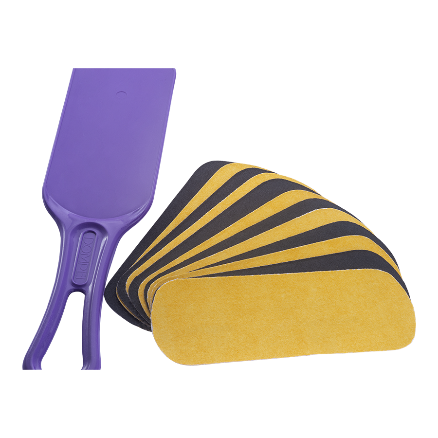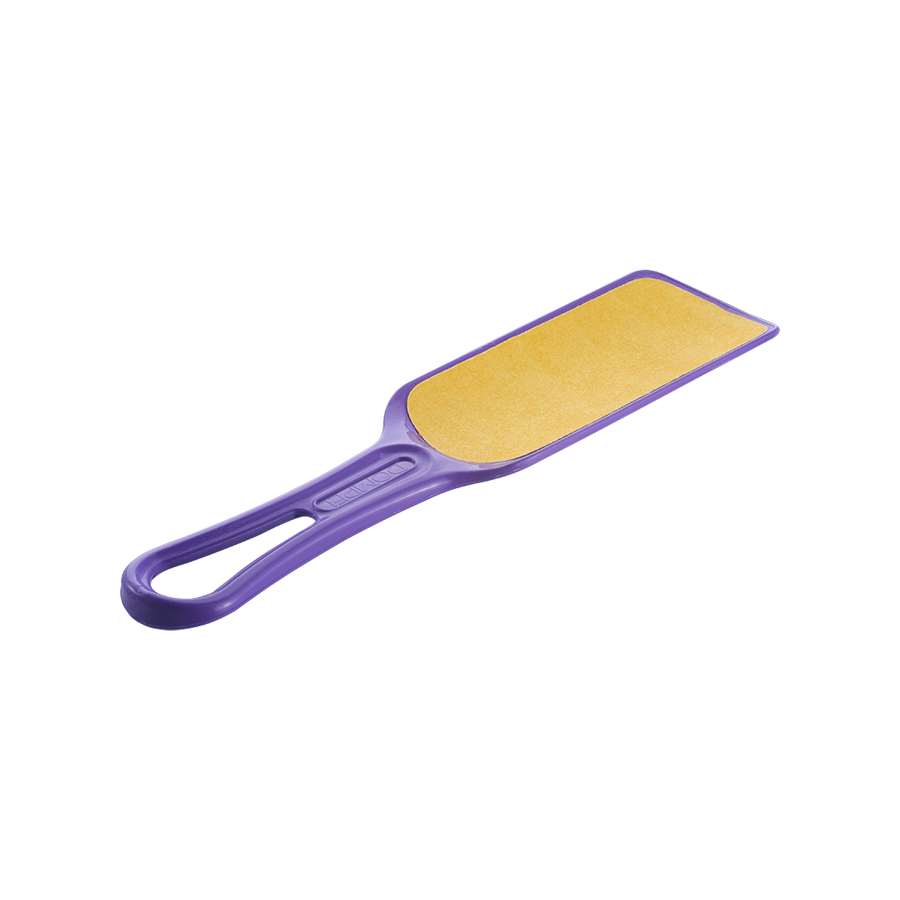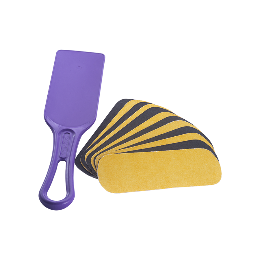The Foot Sand File Holder is made of highly durable and chemical resistant material. The handle is anatomical and the plastic base has a concave / convex shape. This characteristic allows perfect contact adjustment to the shape of the feet and heel during the skin smoothing process. It comes with 12 hygienic and disposable foot sand file refills, which can be used in water or on wet feet.