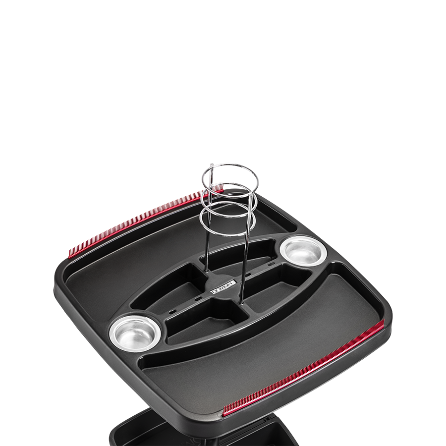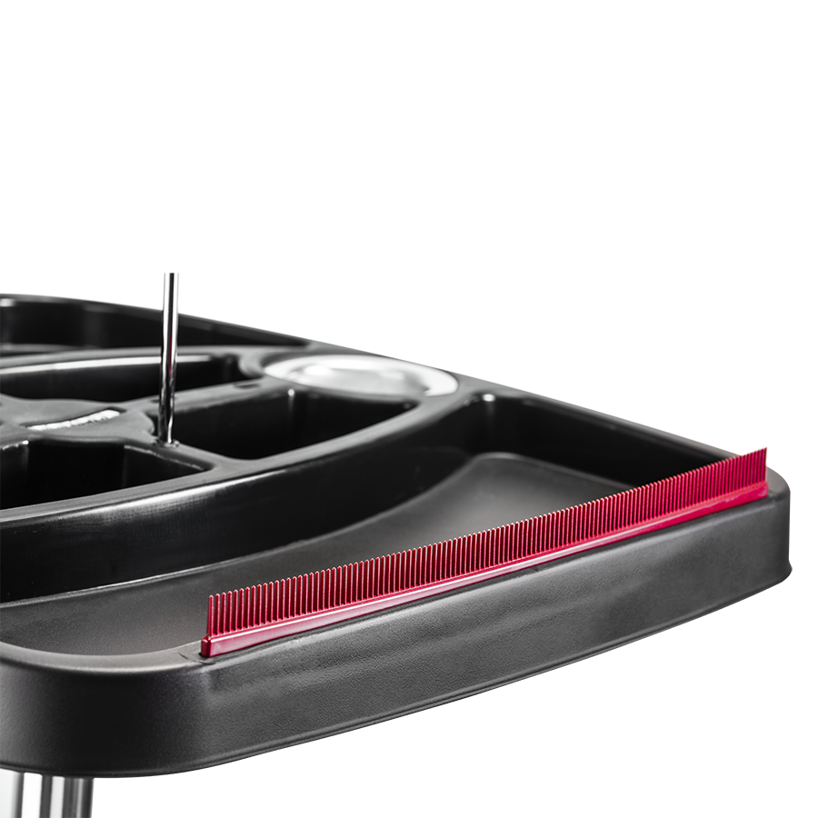 Top: It has a top with an exclusive straightener support, removable metal bowls for glue / keratin, tweezers support, large work area with dividers for organizing different types of accessories, as well as side combs resistant to temperature variation, which are removable to organize and facilitate the handling of hair locks;