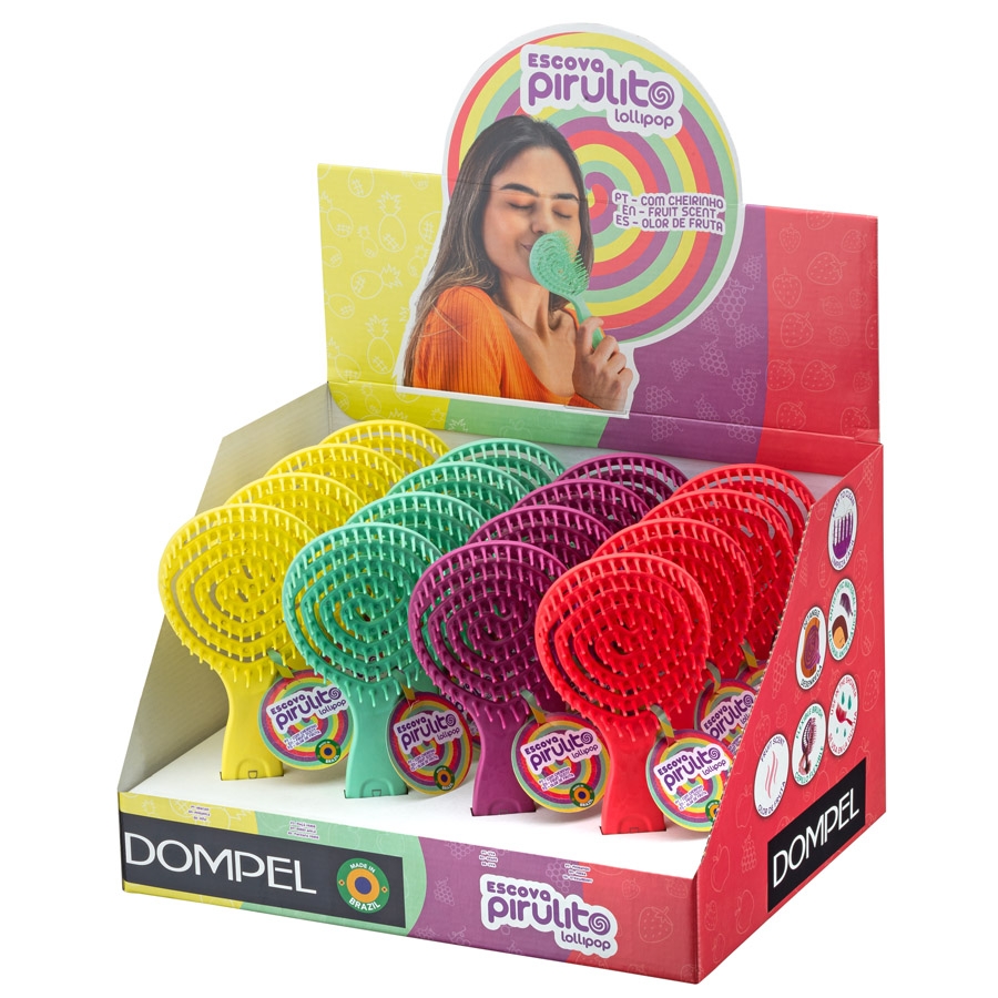 Pioneira com cheirinho no Brasil, a escova Pirulito tem cores divertidas e é a queridinha das crianças, transformando o momento da escovação em brincadeira. Indicada para desembaraçar cabelos finos, lisos ou ondulados e modelar cabelos curtos e médios. Perfeita para praia ou piscina.